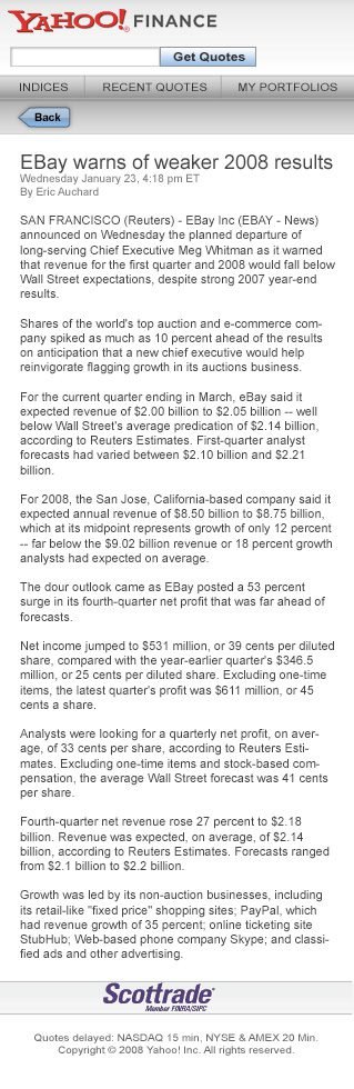 UI for users who access Yahoo! Finance from their iPhone web browser. This design was a prototype for an entry for Yahoo! hack day 2008 that the Yahoo! Finance team submitted. We ended up on 1st place.